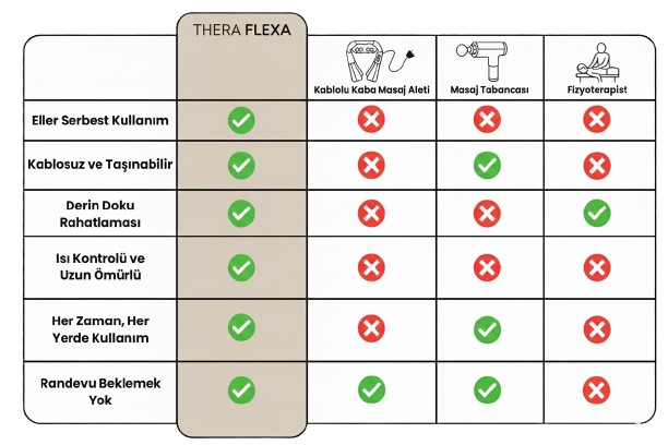 Yandaki tabloya bir göz atın. Neden binlerce kişinin geçici hevesler yerine Thera Flexa'yı tercih ettiğini göreceksiniz. Seçim sizin: Anlık titreşimler mi, yoksa derinlemesine, gerçek bir tedavi deneyimi mi?"
